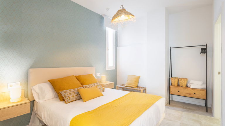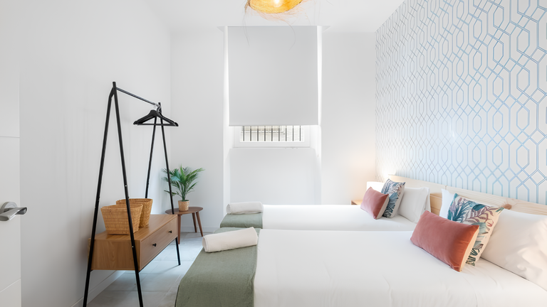 Amenities include air conditioning and heating, free Wi-Fi, flat-screen TV, power outlets near the beds, bed linen and towels, cleaning products, clothes rack, and private access in a quiet building.