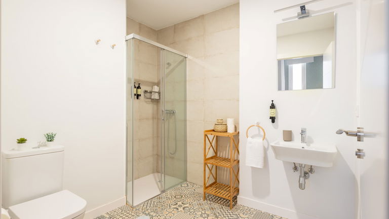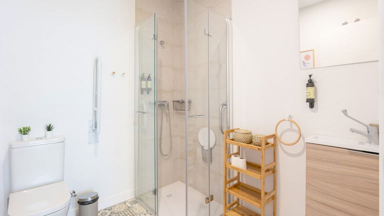 It features two bedrooms, two private bathrooms with showers, a fully equipped kitchen, and a living room with a sofa bed-perfect to accommodate up to 6 guests. The apartment is on the ground floor, with step-free access and a bathroom fitted with support bars.
