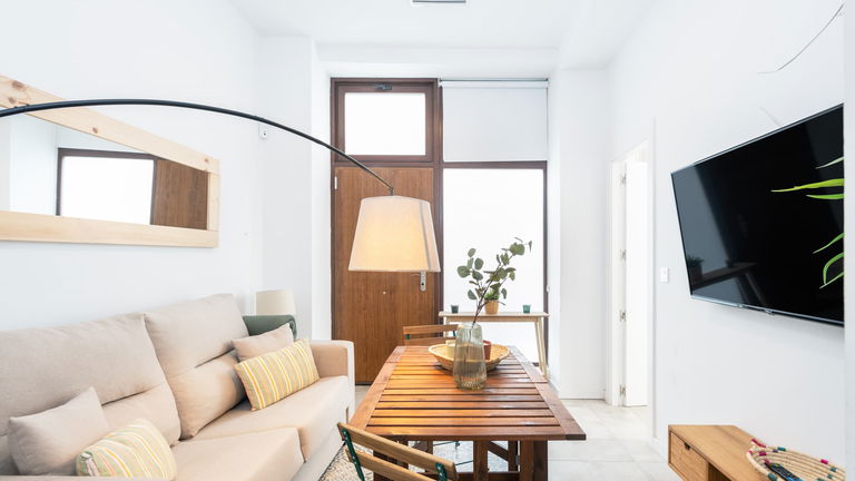 Amenities include air conditioning and heating, free Wi-Fi, flat-screen TV, seating area with sofa, bed linen and towels, cleaning products, power outlets near the beds, and a coat rack. The apartment is located in a quiet building with independent access and is entirely on the ground floor.