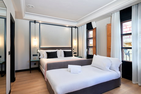 Notre chambre triple se distingue par son espace et sa luminosité. Conçue pour offrir confort, elle dispose de trois balcons permettant de profiter de belles vues et apportant une sensation de fraîcheur et de bien-être. Son design fonctionnel et chaleureux crée l'environnement idéal pour se détendre et partager un séjour confortable dans un espace plein de lumière et de charme.